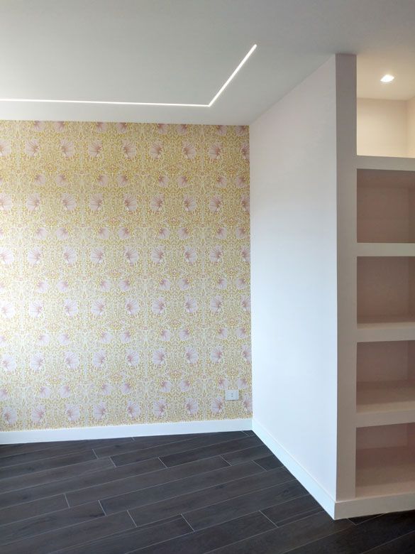 Casa per una famiglia di cinque persone in un fabbricato moderno del Vomero. La realizzazione di falegnamerie in legno di noce nell'ampio salone/living ha la duplice finalità di conferire carattere ed unicità agli ambienti principali e creare uno spazio studio che sia parte del medesimo salone ma al contempo schermato.